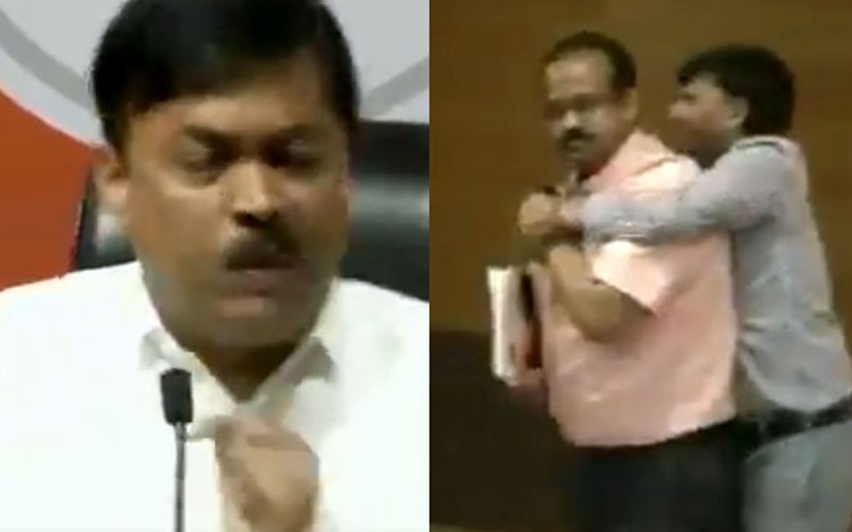 A man flung shoes at BJP leaders addressing a press conference at the party's headquarters here on Thursday. It was not immediately clear why the person, who identified himself as a doctor by profession, threw the shoes.
