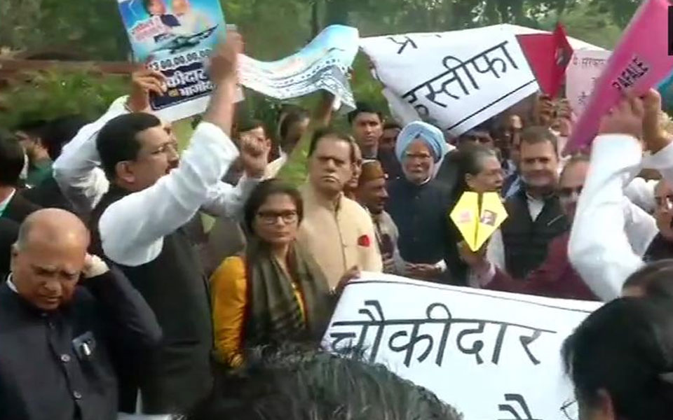 Raising slogans against the Narendra Modi government, Congress lawmakers protested outside Parliament on Wednesday over the Rafale deal.