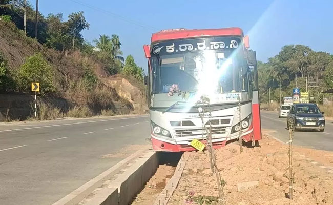 A Karnataka State Road Transport Corporation (KSRTC) bus travelling from Mangaluru to Bengaluru crashed into a divider on the national highway near Surikumeru Raj Kamal Hall on Monday morning after the driver reportedly lost control of the vehicle.