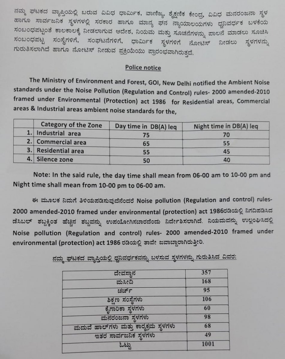 Speaking to reporters here, he said, “it has been noted that a total of 1001 places including 357 temples, 168 mosques, 95 churches, 106 educational institutions, 60 industrial areas and 98 entertainment areas are making use of loudspeakers. Since yesterday, we have set about giving notice, asking them to abide by the rules and regulations regarding the decibel limit for the use of loudspeakers.”