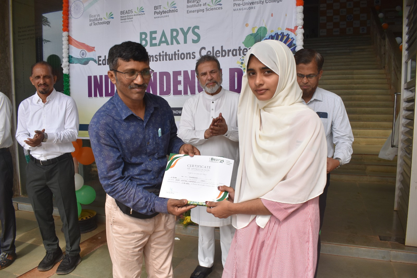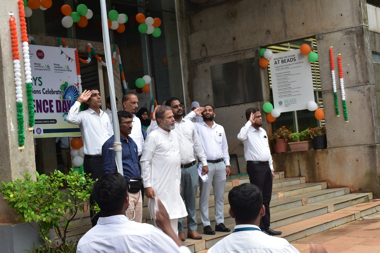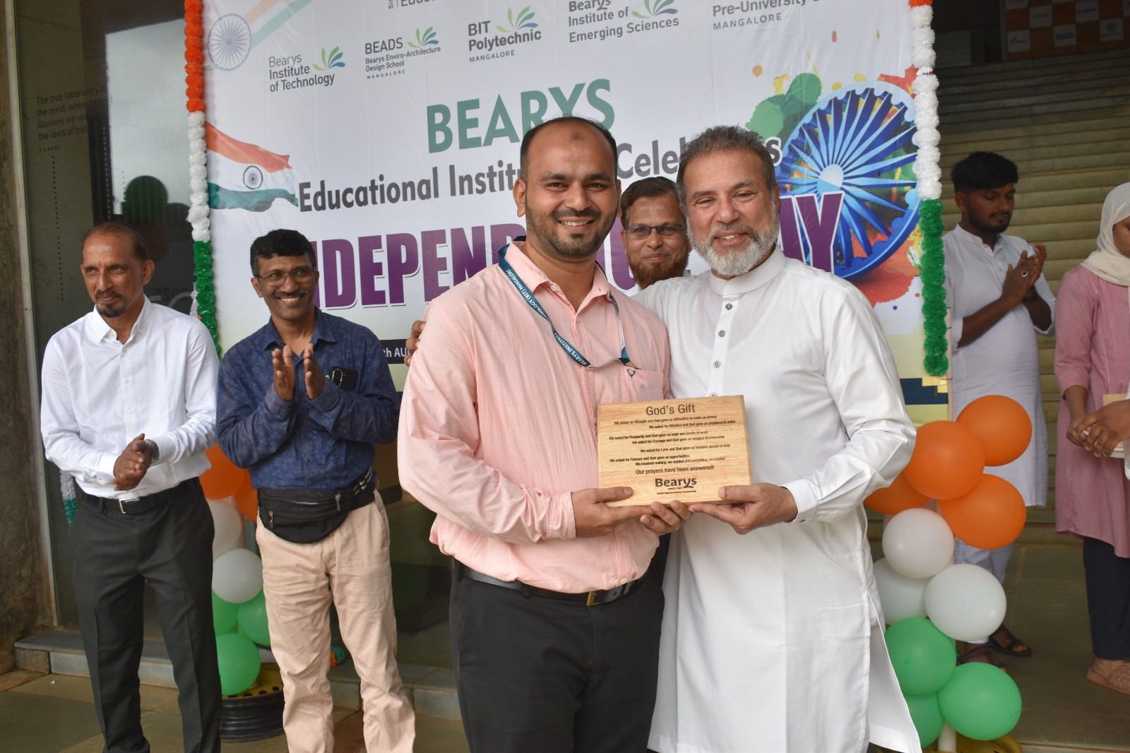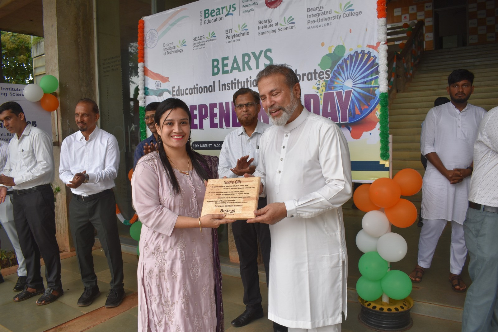 Mangaluru: The Bearys Group of Institutions, Mangalore, celebrated the 79th Independence Day with patriotic fervor and enthusiasm at the Bearys Knowledge Campus, Innoli. The event began at 9:00 AM, with Summaya Nasir from 7th Semester AI & DS delivering the warm welcome address, while Mohammad Hashim efficiently compered the program.