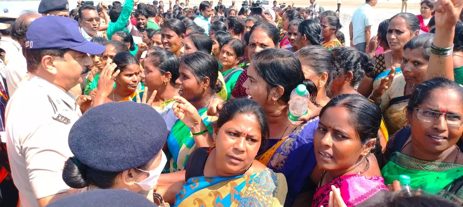 Ankola: Hundreds of fishermen in Keni village, most of whom were found to be women, protested on Monday, and also attempted to commit suicide by jumping into the sea, opposing the construction of a commercial port in Keni.