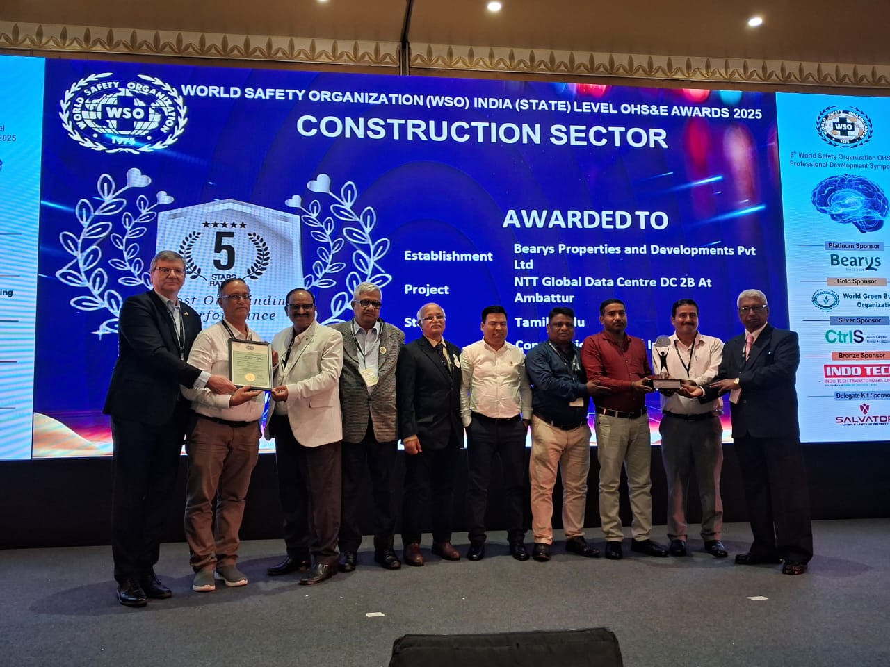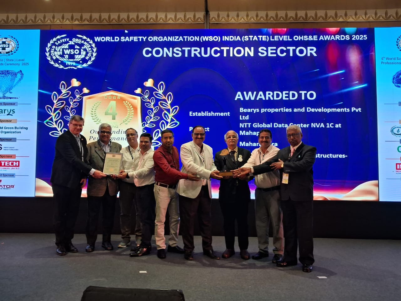 Among the winners was the NTT Data Center (DC2B) in Ambattur, Chennai, developed by Bearys, which received the Platinum 5-Star Award for “Most Outstanding Performance in Occupational Health, Safety & Environment (OHS&E)” the highest recognition in its category. Another project, the NTT Data Center (NAV1C) in Mahape, Navi Mumbai, also developed by Bearys, won the Gold 4-Star Award for “Outstanding Performance in OHS&E.”
