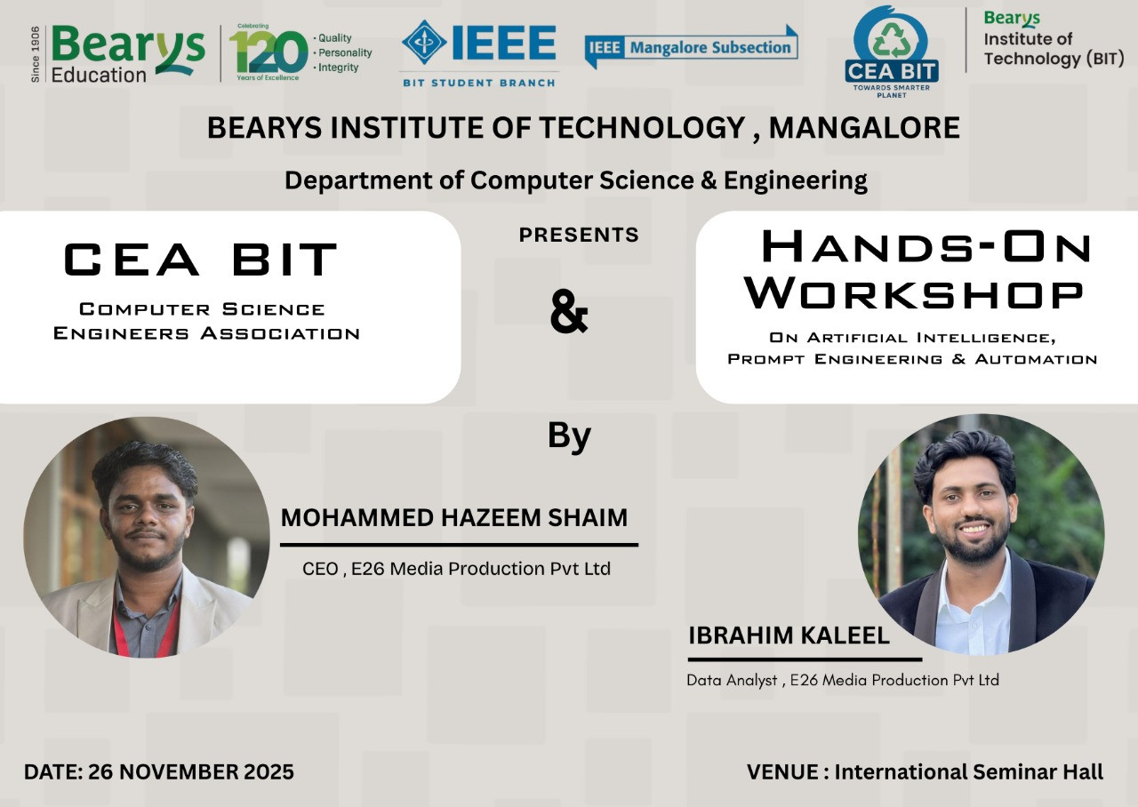 Mangalore: The Department of Computer Science & Engineering at Bearys Institute of Technology (BIT), Mangalore, in association with the BIT IEEE Student Branch, successfully inaugurated the Computer Science Engineering Association of BIT (CEABIT) on Wednesday, November 26. The event took place in the International Seminar Hall.