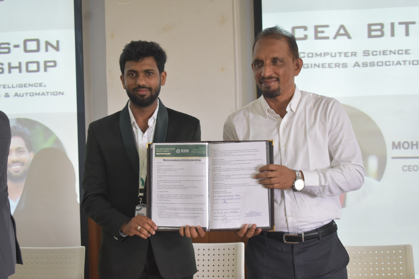 Addressing the students, Dr. Aziz Mustafa outlined the vision for CEABIT and emphasized the importance of innovation and teamwork within the department. The event also saw the signing of an MoU between BIT and E26 Media Production Pvt. Ltd., signed by Dr. Mustafa and company CEO Mohammed Hazeem Shaim.