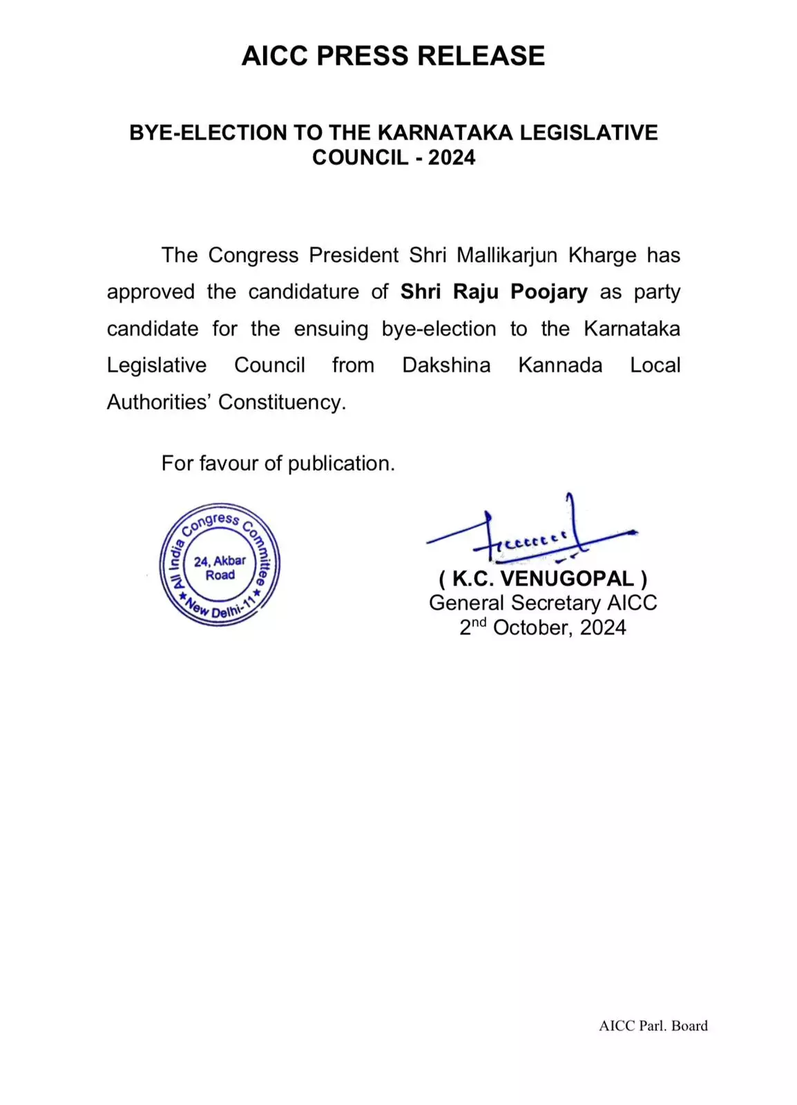 Mangaluru: The Congress party on Wednesday announced Raju Poojary as its DK and Udupi local body candidate for the upcoming by-election to the Legislative Council. All India Congress Committee President Mallikarjun Kharge released an official statement confirming Raju Poojary’s candidacy.