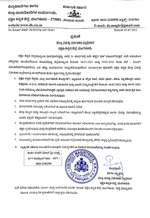 Mangaluru: Dakshina Kannada District Deputy Commissioner Dr. Rajendra on Thursday issued an order extending holidays to schools and colleges in the district till July 8, July 9 2022, Friday and Saturday as a safety measure against the continuous heavy rainfall in the district.