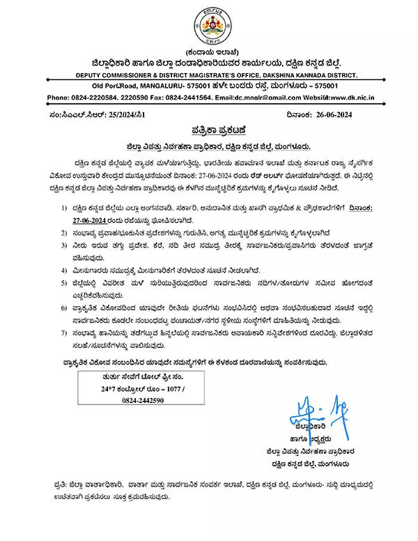 Mangaluru: In response to the intensifying rains in Dakshina Kannada district, the Deputy Commissioner Mullai Muhilan has issued an order to close all schools on Thursday, June 27.