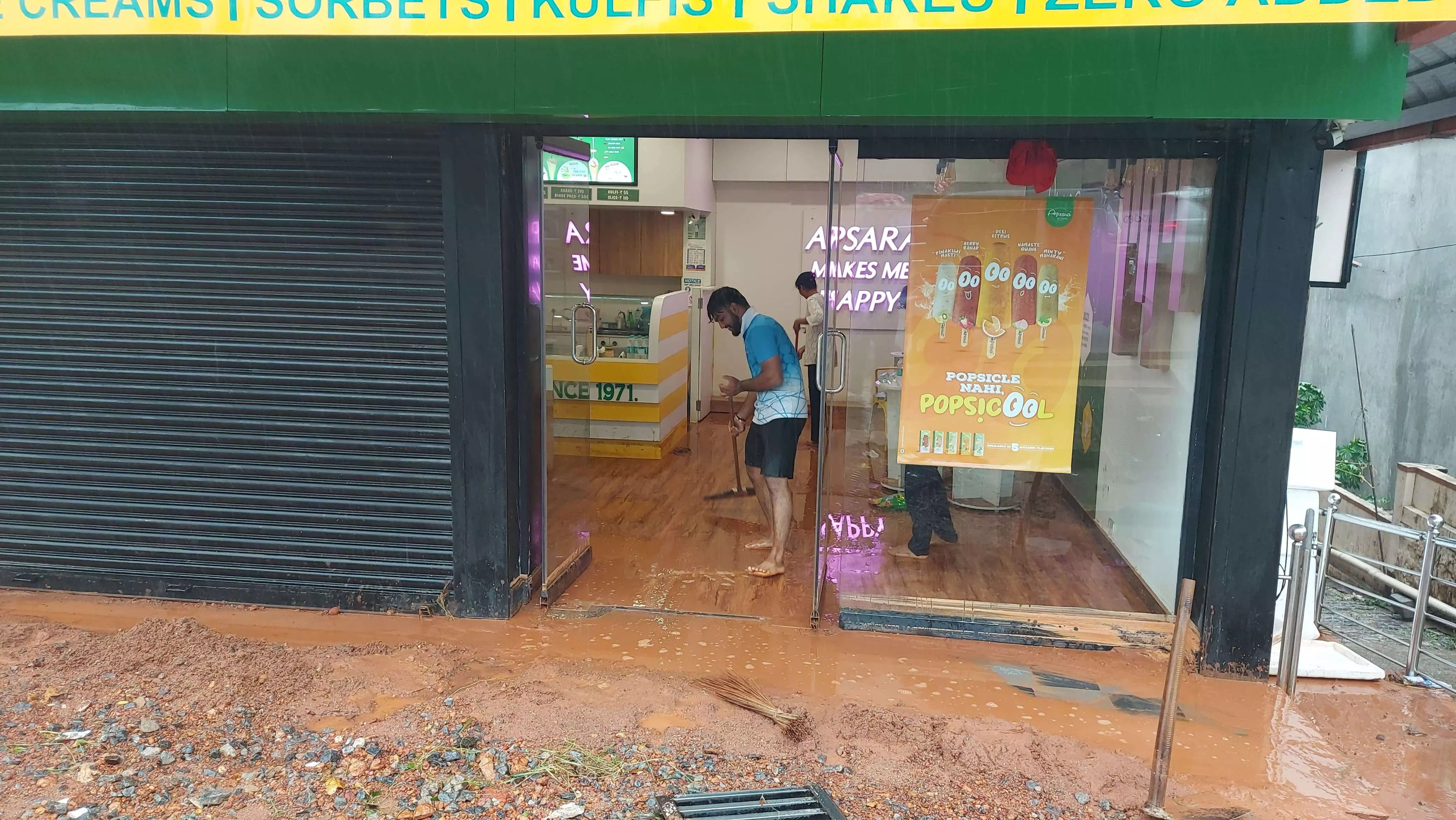 In Lakshmindranagar, muddy water overflowed from drains and entered nearby shops. Commercial establishments located on the lower floors of the Central Park complex near INOX were flooded with slush and debris, causing significant damage. Municipal workers rushed to the spot and carried out a clearance operation using JCB machines.