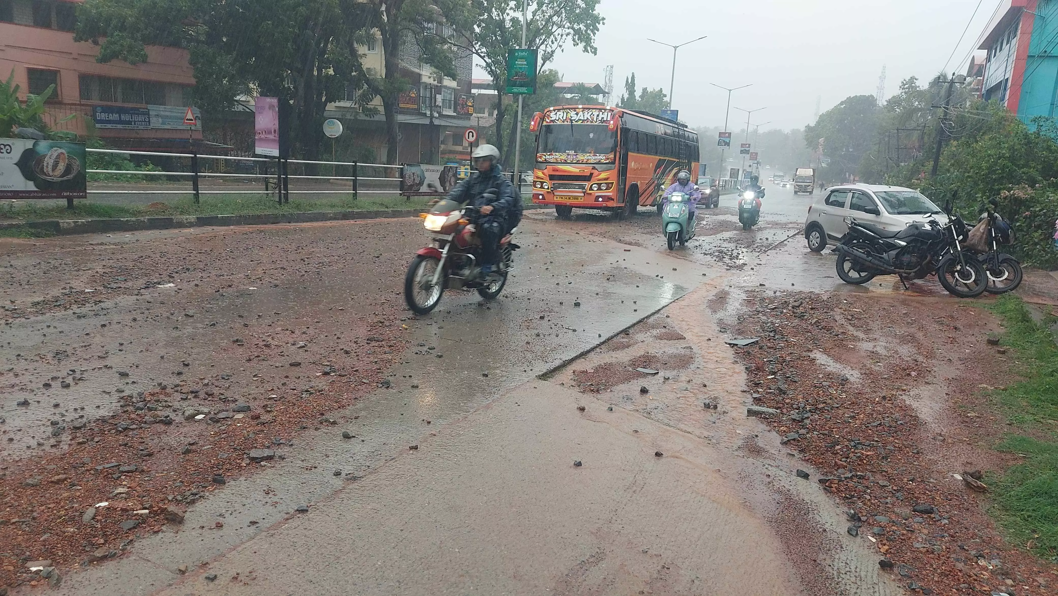 On the Udupi–Manipal National Highway 169A, between INOX Manipal and Syndicate Circle, rainwater washed away the soil that had been filled along the roadside, creating a dangerously deep trench. The displaced mud and rocks flowed toward the Lakshmindranagar area, covering the road with slush and debris, which hindered vehicle movement. Traffic was diverted temporarily due to the condition of the road.