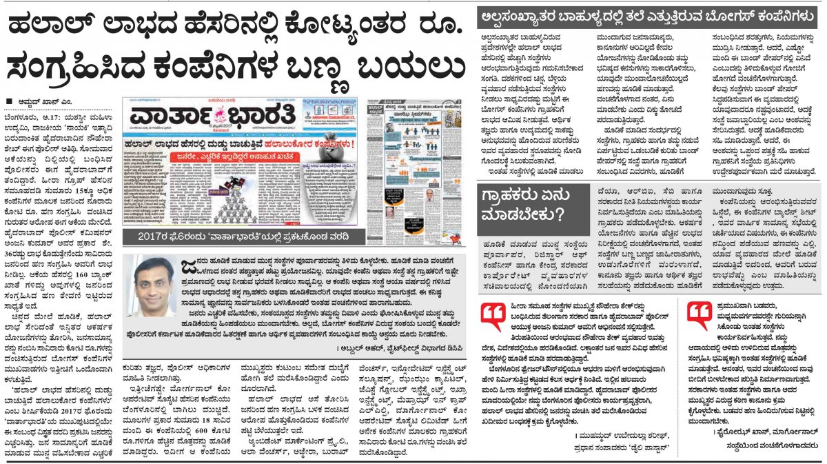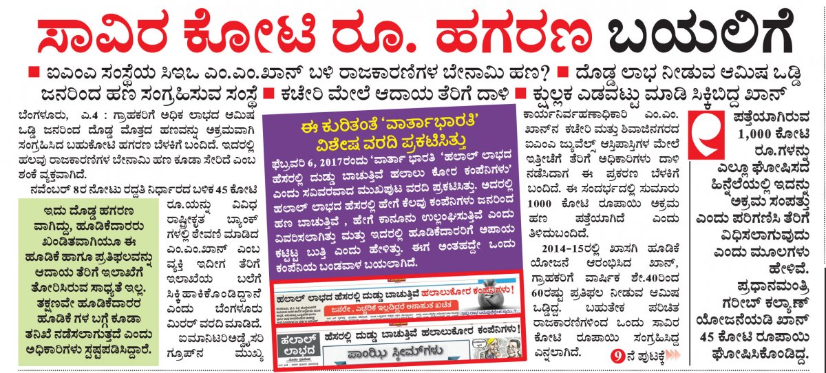On February 6, 2017, 'Vartha Bharti' had alerted people about such companies by publishing a detailed article on its front page. In the article, it was described that how some companies are making money on the name of Halal profit and violating the law. It had warned that the risk is for the investors is sure in this investment. The Vartha Bharati had also a published a detailed report when the Income Tax department had conducted a raid on the IMA Company in April 2017 and found irregularities of Rs 1,000 crore. But IMA chief Mansur Khan had clarified that there was no irregularities in the company. Vartha Bharati had come with a detailed report even when Nauhera Shaikh was arrested in Hyderabad in October 2018 (Oct.18).