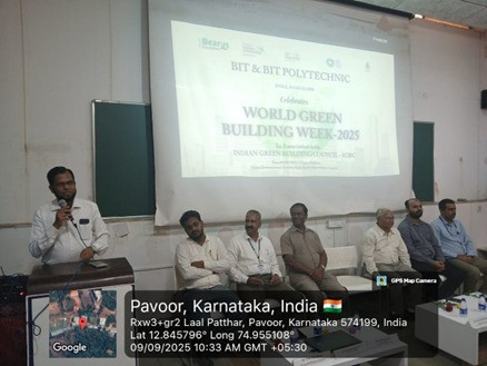 Prof. Prithviraj , Director of BIT Polytechnic, motivated students to actively participate in all the activities planned during the week. The Chief Guest, Dr. Palakshappa, HoD of Civil Engineering, PA College of Engineering, delivered an inspiring talk on “Green Buildings, Smart Living”, emphasizing the role of sustainable architecture in modern society.