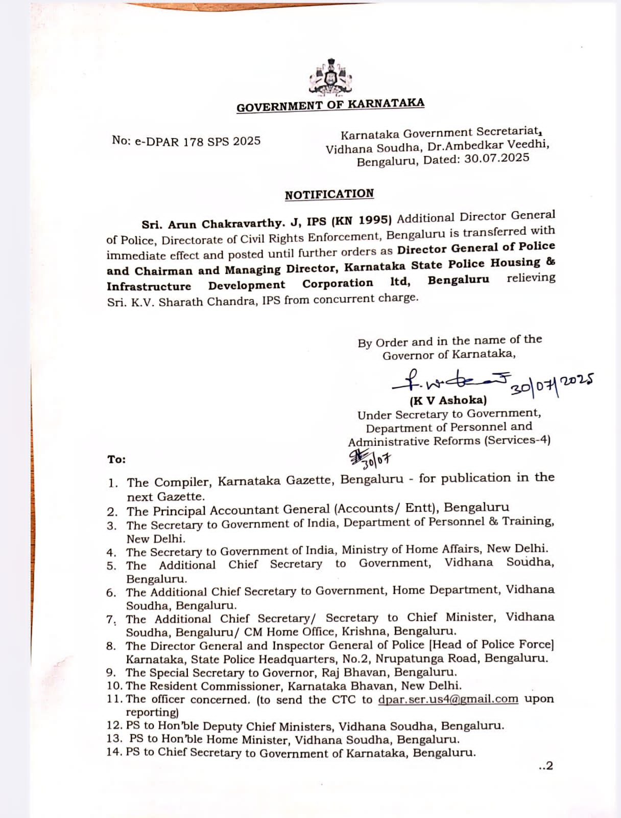 Bengaluru: Senior IPS officer Arun Chakravarthy has been promoted from Additional Director General of Police (ADGP) to the rank of Director General of Police (DGP).