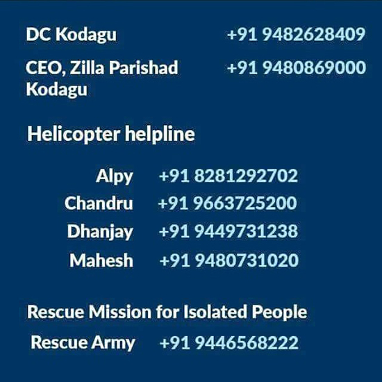 NDRF and the fire brigades have rescued 11 people, including a pregnant woman. Here are some helpline numbers to assist the victims of the Kodagu floods.