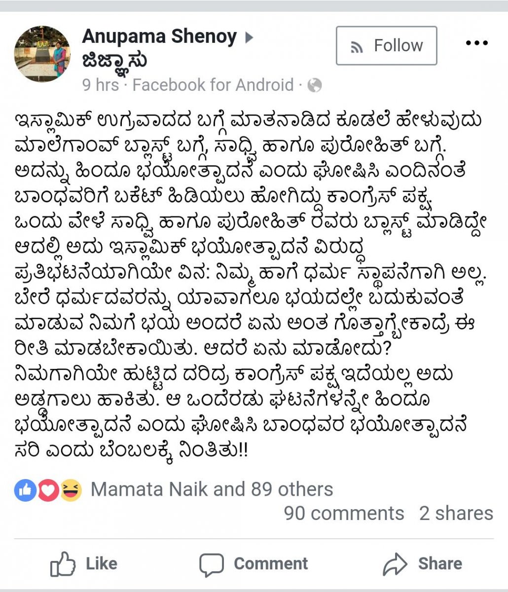 In a Facebook post that she posted in a group of popular social media site she added “Whenever there is a discussion about Islamic terrorism, the Congress party talks about Malegaon blast, Sadhvi Pragya Singh Thakur and Col. Purohit Singh and bring propagates about ‘Hindu Terrorism’. Even if Sadhvi Pragya and Col. Purohit conspired and carried out the Malegaon blast, it was protest against the Islamic terrorism. Not to spread Hinduism unlike Islamic terrorism” she wrote.