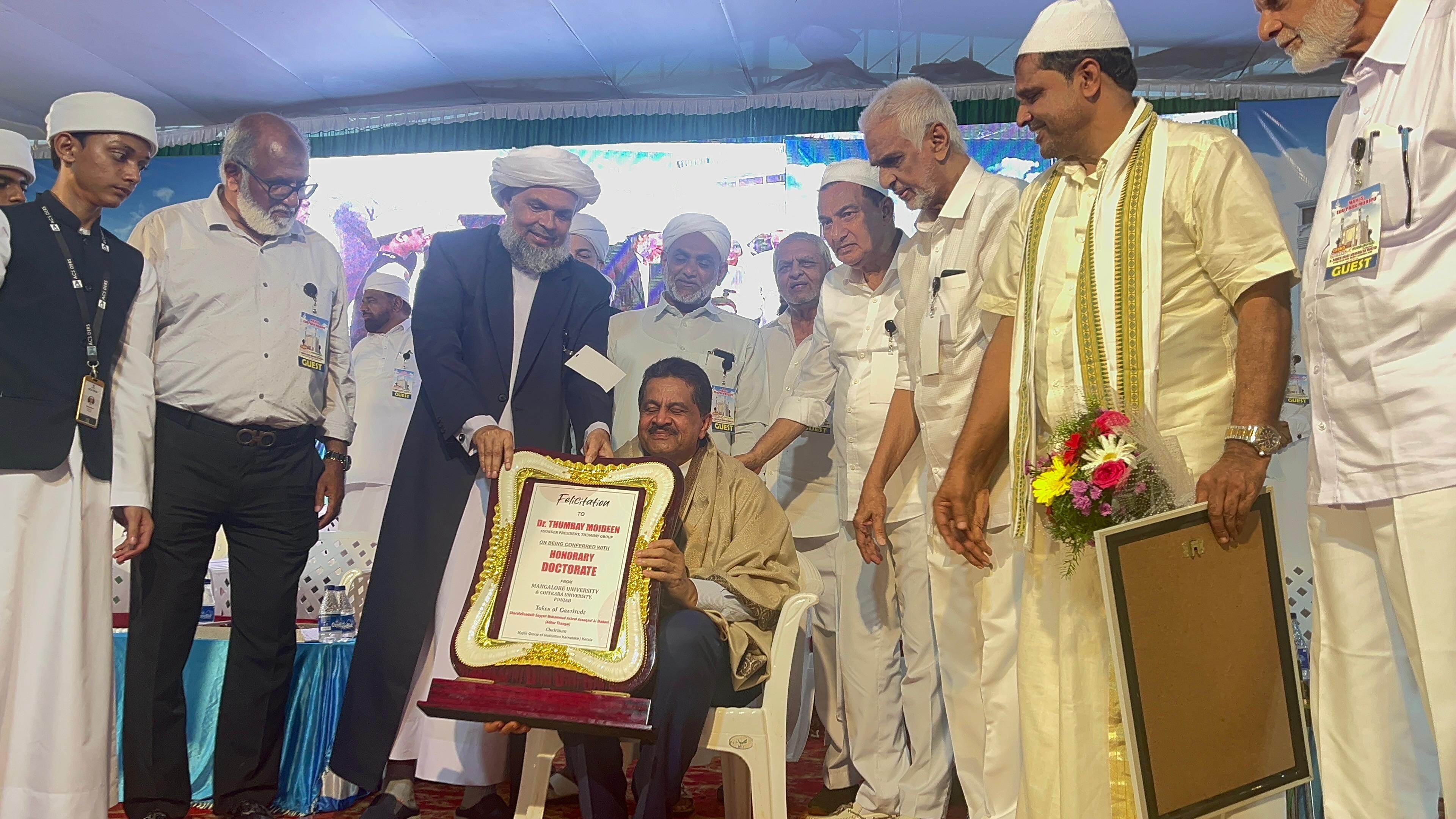 During the event, Dr. Thumbay Moideen and Dr. Yenepoya Abdulla Kunhi, Chancellor of Yenepoya University, were honored for their contributions. Several prominent personalities, including BM Ashraf of the Thumbay family, Sayyid Shaheer Al Bukhari Malhar Thangal, Dr. MSM Abdurrashid Zaini Kamil, Badusha Saqafi Alappuzha, and Muhammad Ali Saqqafi Ashhariyyah, were present.