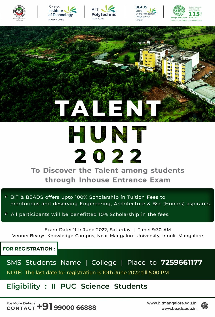 The purpose of the talent Hunt is to offer upto 100% scholarships for the meritorious and deserving students who are seeking admission to Engineering/Architecture / BSc(Honors) courses at Bearys Institute of Technology(BIT), Bearys Enviro-Architecture Design School(BEADS), Mangalore.
