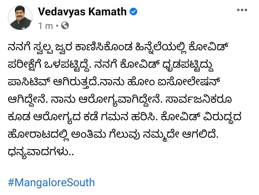 Mangaluru: BJP leader and Mangaluru South MLA Vedavyas Kamath has tested positive for COVID-19. He shared the news through a social media post.