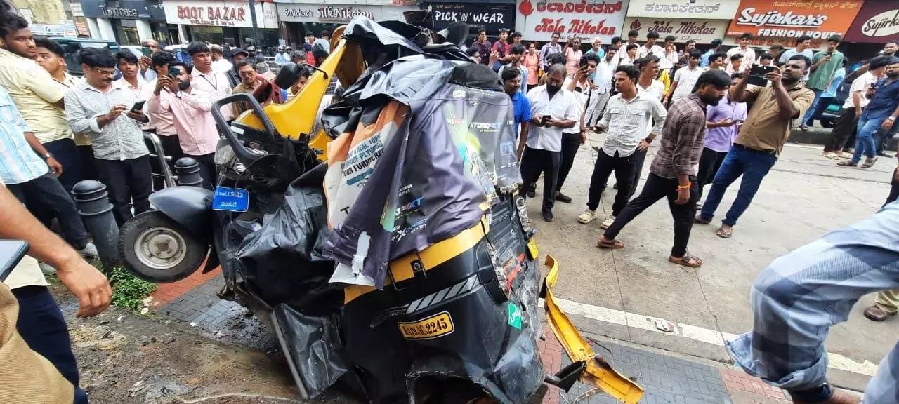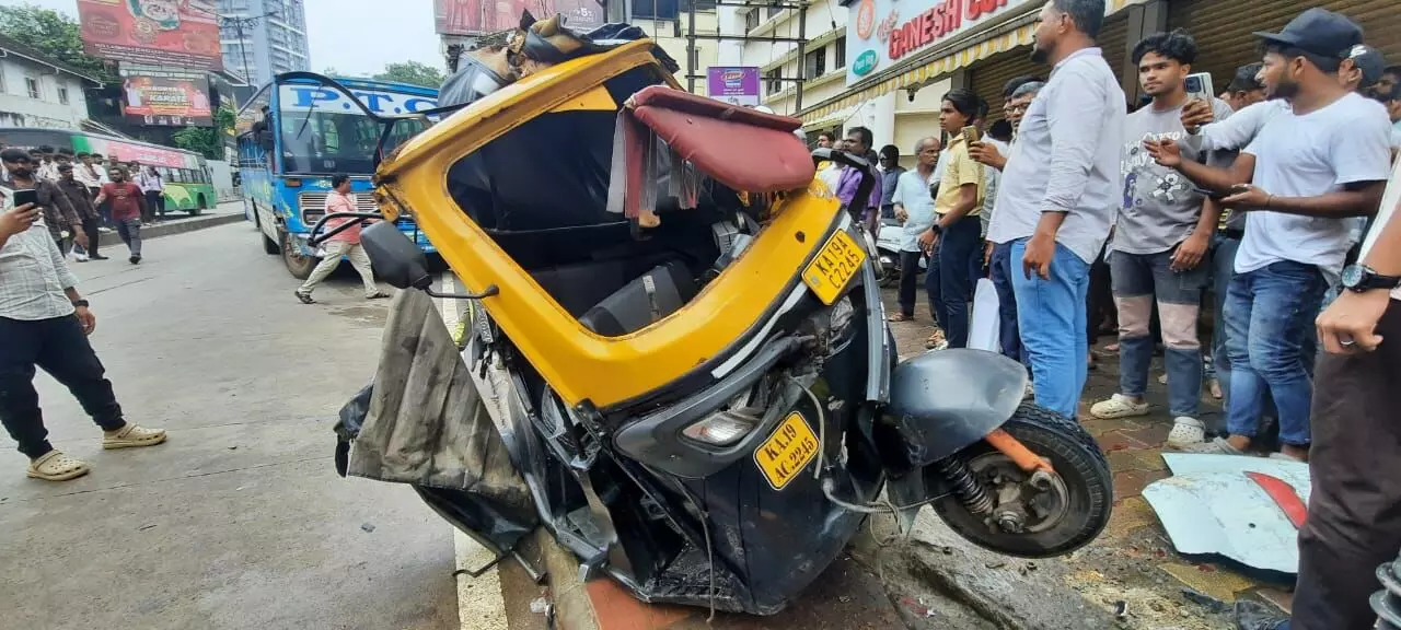 Reports state that the diver of the private bus, moving toward Statebank via Balmatta road, developed giddiness due to increased blood pressure near Hampankatta. He lost control over his vehicle and rammed into the other vehicles parked beside the road. Usman, his wife Ramla and son Muhammad Nazal, residents of Jeppu Bappal, were inside the rickshaw which was hit by the bus. They sustained minor injuries in the accident. However, the auto was completely wrecked due to the impact.