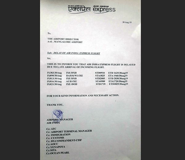 IXE-DXB, BAH/KWI-IXE, IXE-DXB, AUH-IXE and IXE-DOH are the flights that be running with delays on August 30. The press release was issued by Air India, Airport Manager.