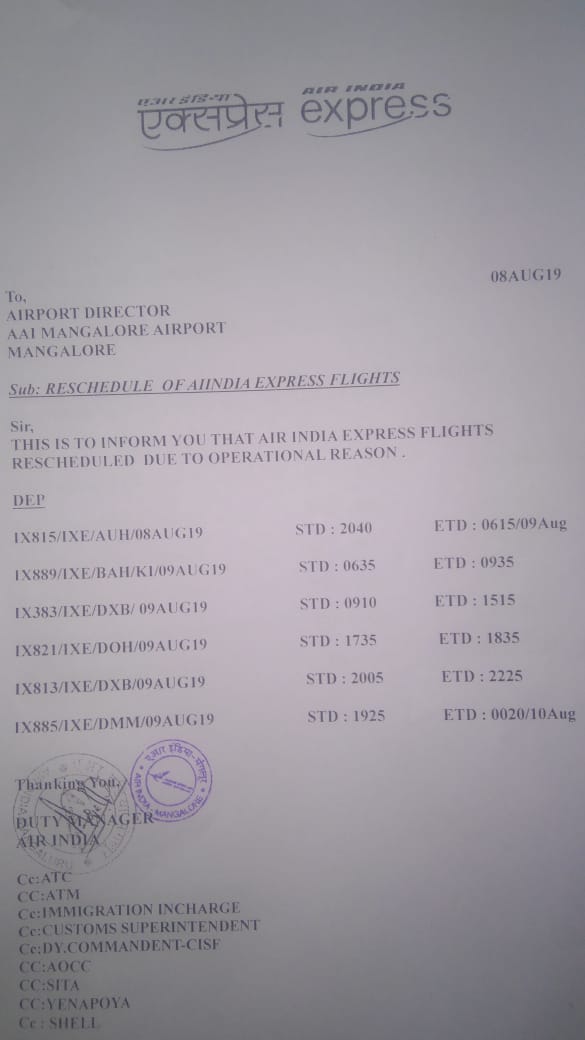 Schedules of Abu Dhabi, Bahrain, Dubai, Doha, Dammam bound flight from Mangaluru Airport have been rescheduled, airport officials informed.