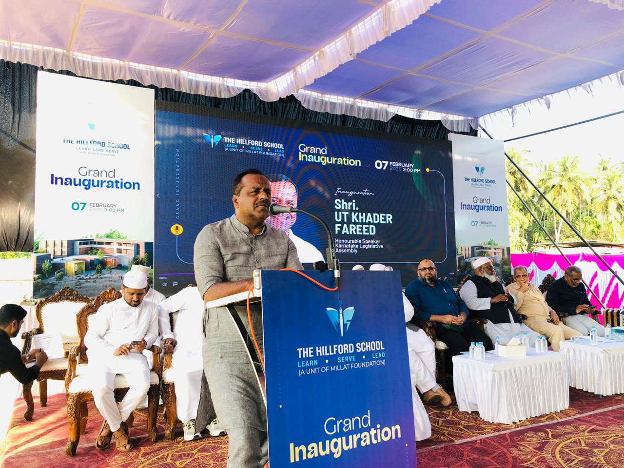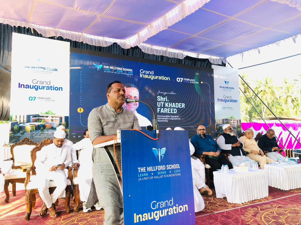 Mangaluru: The Hillford School (A unit of Millat Model School) was inaugurated at Patla, Kallapu, in Ullal taluk, with Karnataka Legislative Assembly Speaker UT Khader inaugurating the campus.