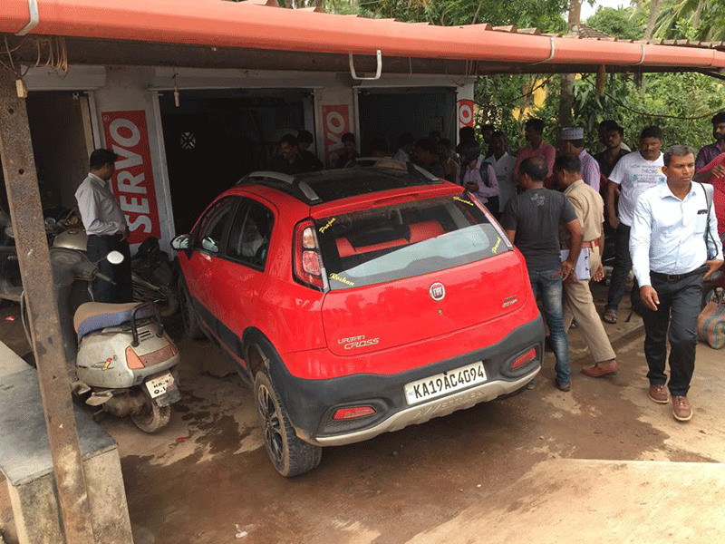 Padubidri: A car rammed into a garage after colliding with a bike when its driver lost control over the vehicle at Kalsank near Padubidri on Wednesday morning.