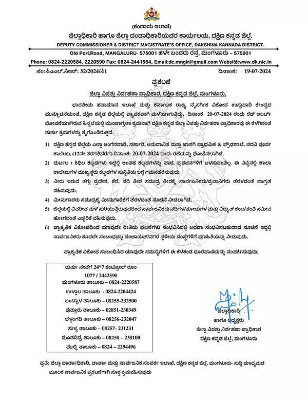 Mangaluru: Dakshina Kannada district Deputy Commissioner Mullai Muhilan issued an order declaring holiday for schools and PU colleges on Saturday, July 20.