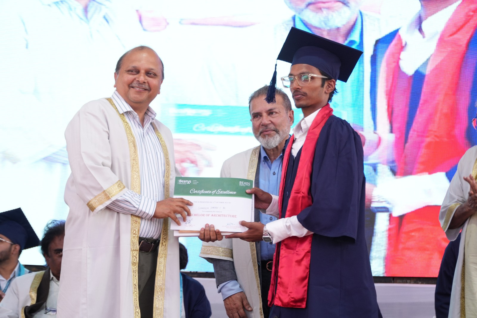 Also present on the dais were Abdul Rahman Beary, President of Bearys Group of Educational Institutions, Kodi, and Dr. Asif, Trustee of the institution. The ceremony was attended by Ar. Khaleel Razak (Principal, BEADS), Dr. Prithviraj (Director, BIT Polytechnic), Prof. Abdul Latheef (Principal, BIPU), heads of various departments, faculty members, alumni, and proud parents.