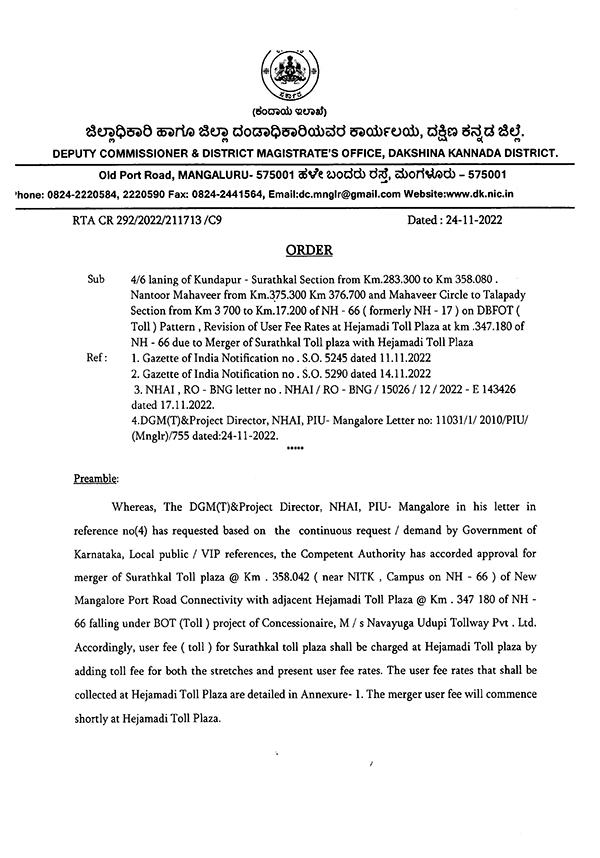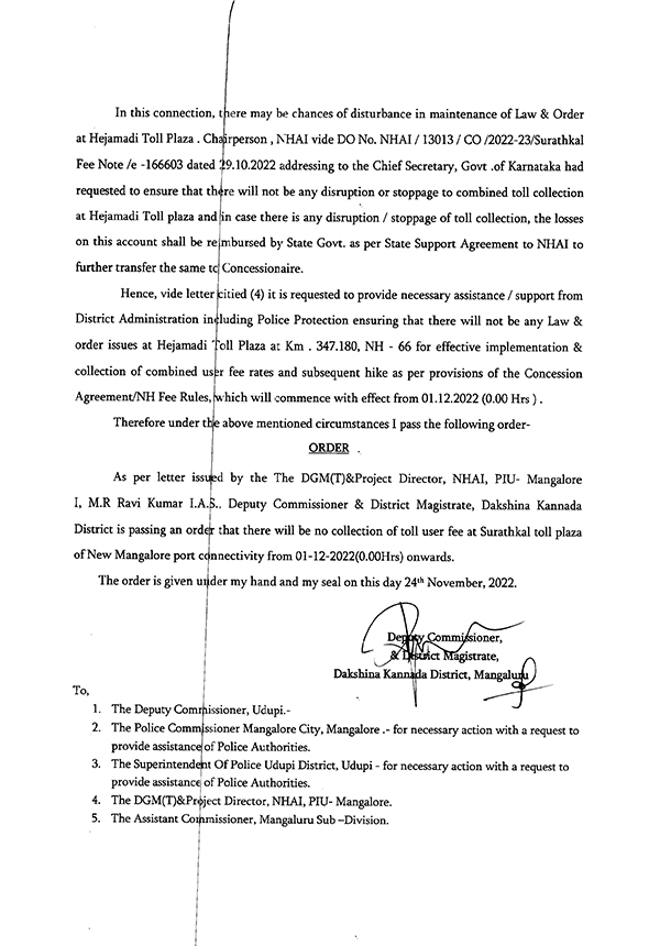 The order from NHAI also says that in order to ensure that there is no disruption or stoppage to the combined toll collection at Hejamadi toll plaza or in case there is any disruption or stoppage of toll collection, the losses on this account shall be reimbursed by the state government as per the state support agreement to NHAI.