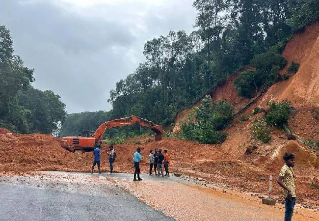 Mangaluru: A major landslide occurred early Thursday morning at Mannagundi near Kaukradi village in Uppinangady, disrupting traffic on the Mangaluru–Bengaluru National Highway. Due to the heavy rains overnight, a large section of soil from a hillside collapsed onto the road, bringing vehicular movement to a complete standstill.