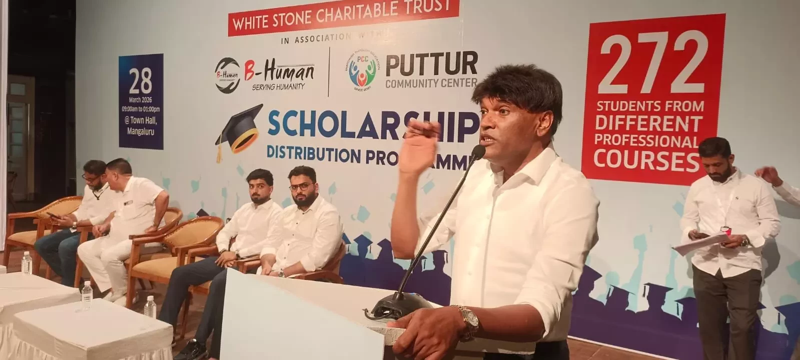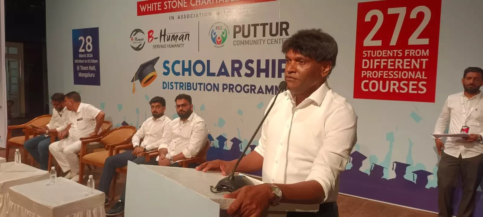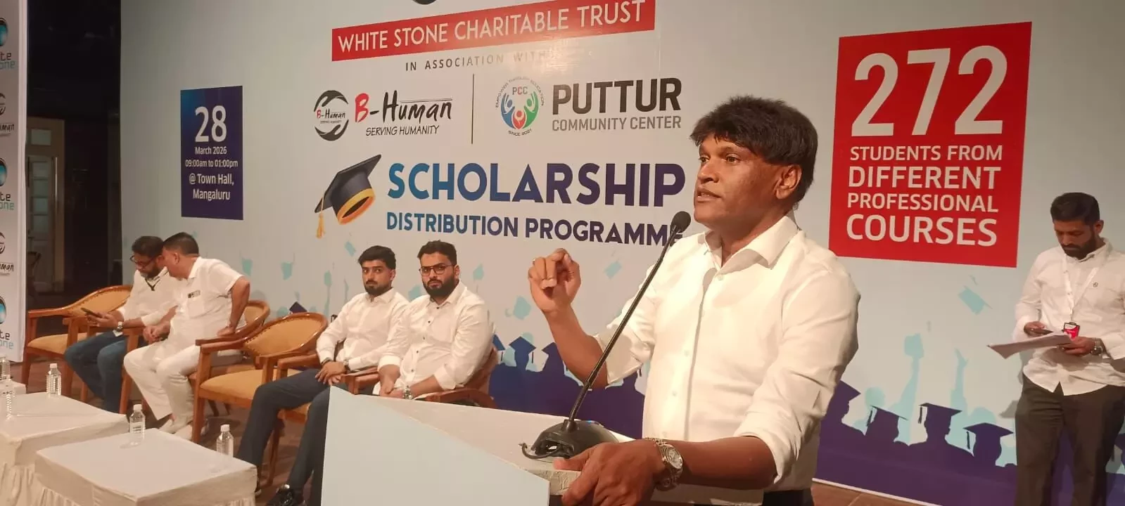 Hanif Puttur of the Puttur Community Center said that the organisation, which has been functioning for the past five years, has been supporting students under the leadership of Team B-Human, and scholarships have been distributed this year as well as in the previous year. He added that a total of 836 students are currently pursuing professional education, including 79 in MBBS, 25 in BDS, 26 in BAMS, 85 in CA, and 35 in Law. He emphasised that the initiative is not limited to any one community and that assistance is being extended to students from all communities.