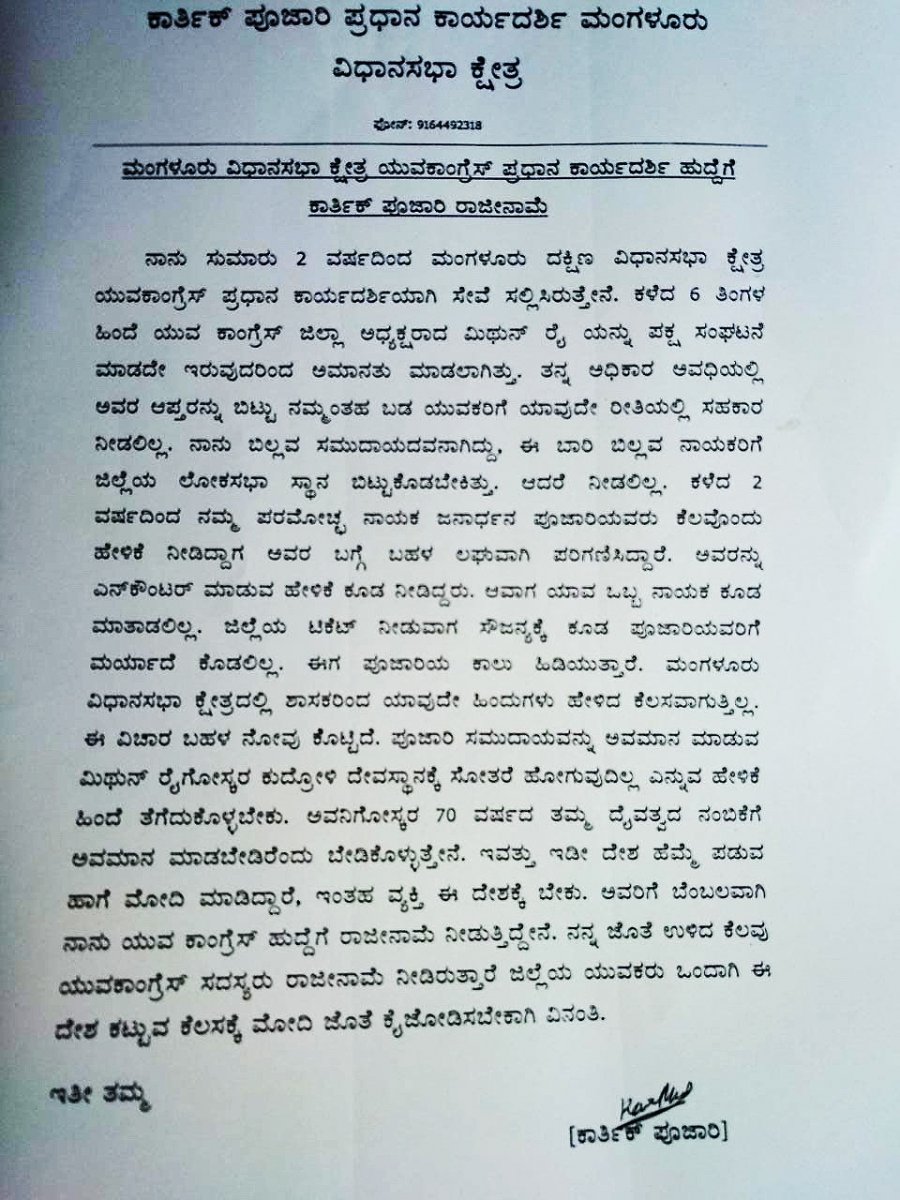 "I have served as the general secretary of the Youth Congress in Mangaluru Assembly constituency for the past two years. Six months ago, the party had suspended the District Congress youth president Mithun Rai. During his term, he did not cooperate with the poor youths except his friends. This time, the Billawa community should had got the Lok Sabha ticket," he said in his letter.