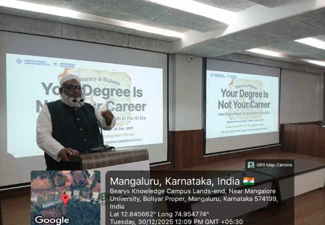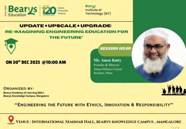 A student development session was held at Bearys Institute of Technology (BIT), Bearys Knowledge Campus, on December 30, 2025, at the International Seminar Hall, led by nationally and internationally respected educator, mentor, and career strategist Anees Kutty.