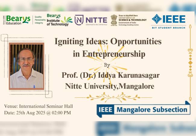 Bearys Institute of Technology (BIT), in association with IEEE BIT Student Branch and IEEE Mangalore Subsection, organised an invited talk on “Igniting Ideas: Opportunities in Entrepreneurship” at the International Seminar Hall on August 25.