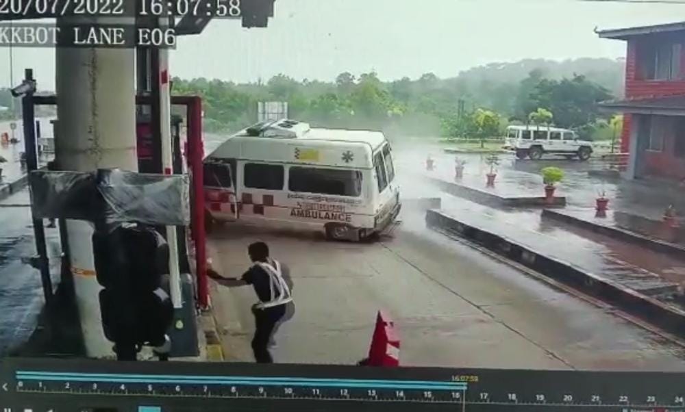 Byndoor: In a horrific road accident that took place at the Shiroor toll gate on Wednesday evening, an ambulance carrying a patient from Honnavar towards Mangaluru crashed at the toll gate after the driver lost control over the vehicle.
