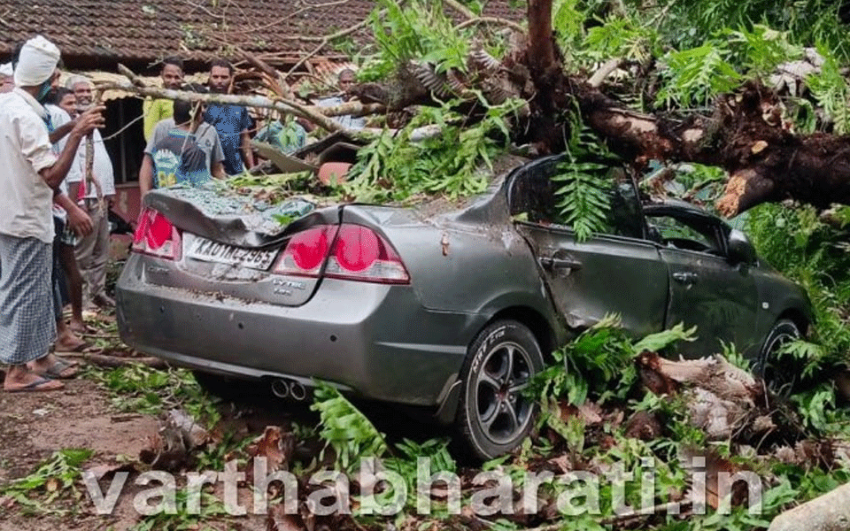 Bantwal: Three female passengers traveling in a car escaped unhurt while the driver of the car sustained minor injuries when a huge tree fell on their car on Saturday afternoon here near Sajipanadu in Bantwal Taluk.