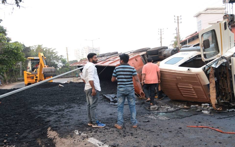 In an accident that reportedly occurred early on Wednesday, the driver of a tipper lorry transporting Asphalt mix lost control over the vehicle resulting in it toppling over in the outskirts of the city near Padil.