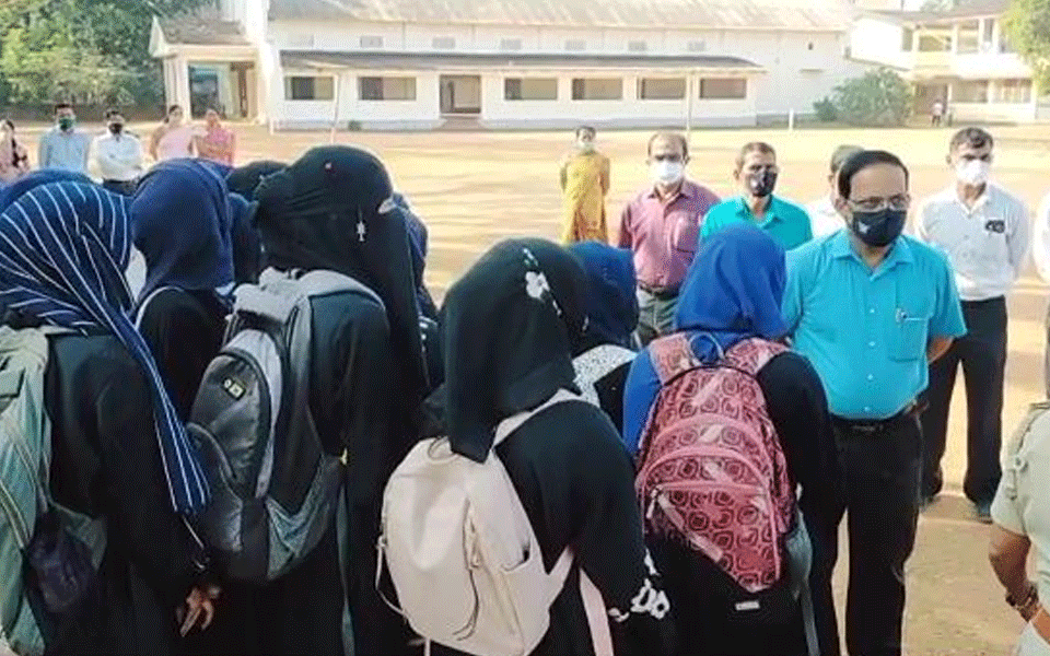 Udupi: Muslim girl students, who tried to enter a government pre-university college at Kundapur in Karnataka's Udupi district wearing hijabs (headscarves), were again denied entry to the premises by authorities on Friday, the third day since the issue surfaced in the institution.