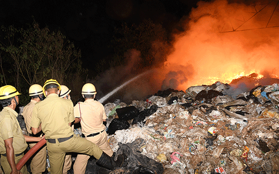 In an incident that occurred on Sunday night, a fire mishap in the dumping yard in Pachanady prompted the fire service department to undertake a night-long operation to extinguish the fire. While the garbage heaps in the site burned to the ground, no other life-threatening damages have occurred in the surrounding areas, it is learned.
