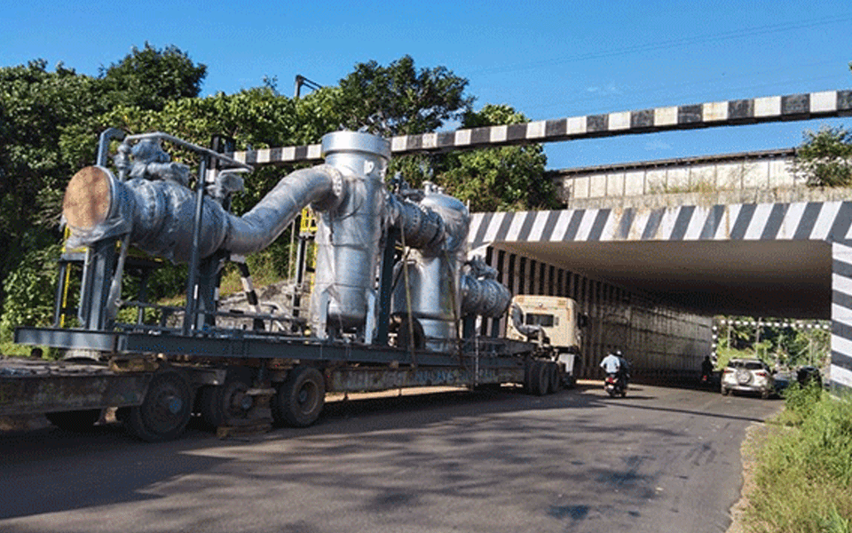 Two commercial Lorries transporting oversized machinery to MRPL became stranded near the Padil overpass on Tuesday, leading to a traffic jam that hindered the movement of other vehicles in the area.