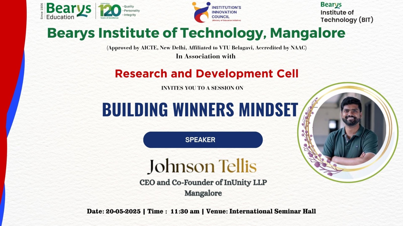 Bearys Institute of Technology (BIT), Mangalore, organised a motivational session titled “Building Winners Mindset” for first-year engineering students on Friday at the International Seminar Hall. The programme was hosted by the institute’s Research and Development Cell and the Department of Basic Science.
