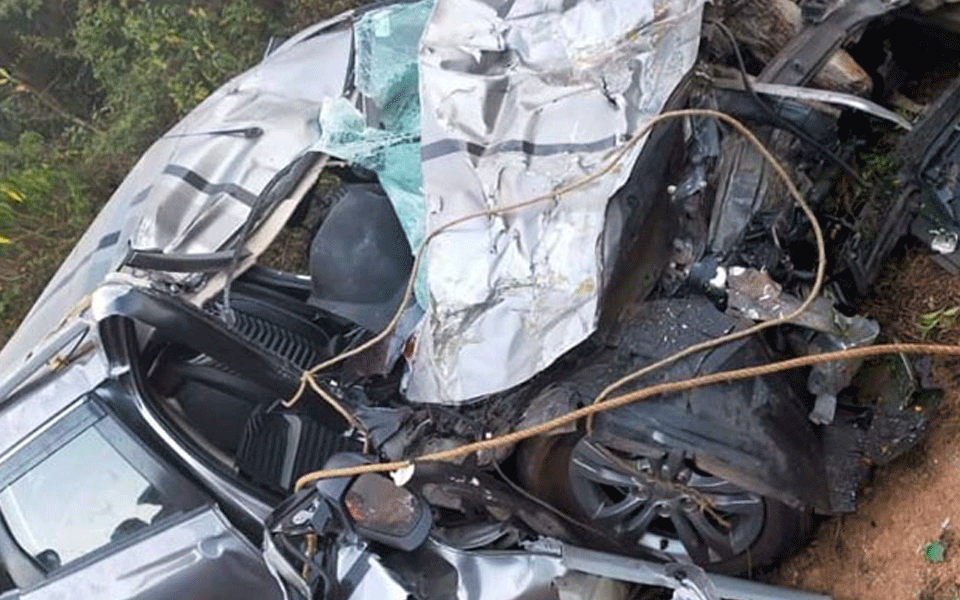 Fatal collision between a car and a tanker killed two people including a lady on Sunday morning here at Bedrodi,on the Mangaluru-Bengaluru NH 75.