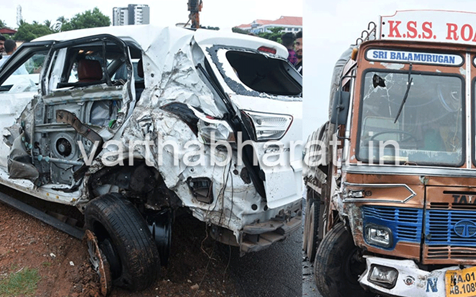 Mangaluru: A truck rammed into a car injuring three people including a woman and a kid on NH 66 near Pumpwell in the city on Tuesday afternoon.