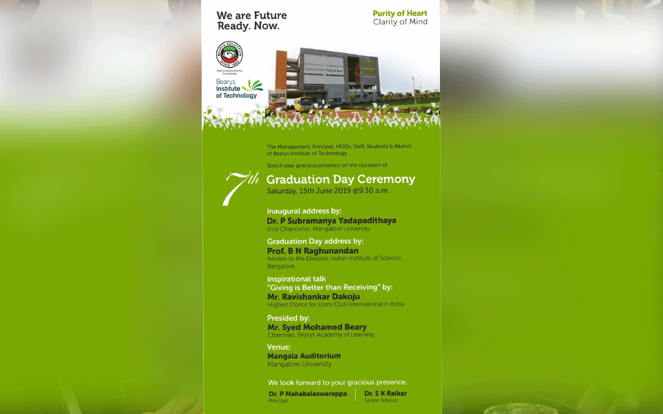 Mangaluru: Bearys Institute of Technology (BIT) will organise its seventh annual graduation ceremony on June 15, at Mangala Auditorium, Mangalore University, Konaje. The ceremony is scheduled to begin at 10.30 am.