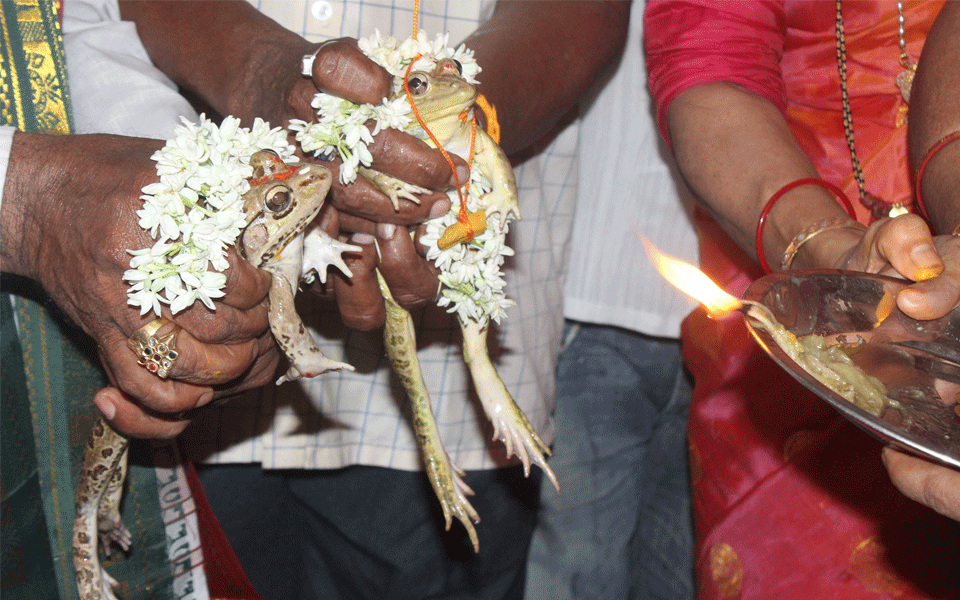Udupi: With the water level going down at the Baje dam, across the Swarna, from where drinking water is supplied to Udupi city, the Udupi Zilla Nagarika Samiti conducted a wedding ceremony of a male and female frog praying for rains, here on Saturday.