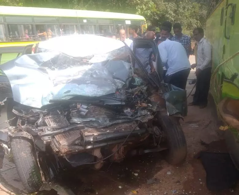Sirsi: Five persons were killed after the car they were travelling in collided with a state-owned bus at Bandal village in Sirsi Taluk of Uttara Kannada district on Friday, police said.