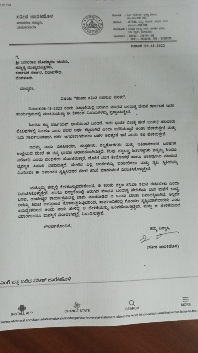Pointing out that his statement was only referring to what has been written and published, the MLA from Yamakanmardi constituency wrote a letter addressed to Chief Minister Basavaraj Bommai alleging that some vested interests were trying to project him as "anti-Hindu", and sought an inquiry into it.