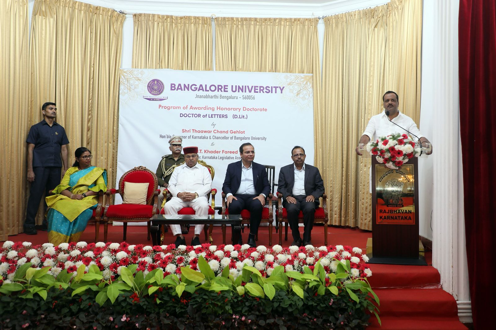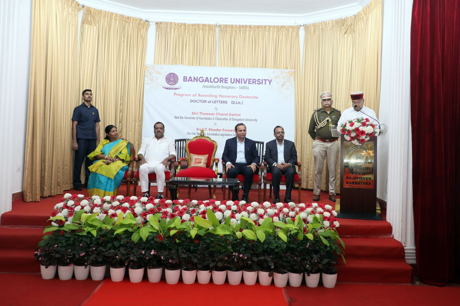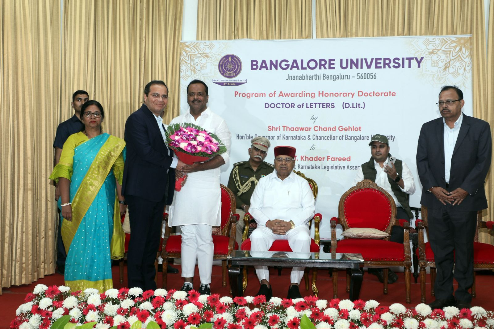 Bengaluru: Bangalore University awarded an honorary doctorate to Karnataka Legislative Assembly Speaker U.T. Khader, which was presented by Governor Thawar Chand Gehlot. The ceremony took place at the Banquet Hall of Raj Bhavan.
