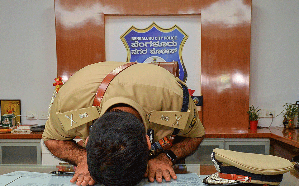 Newly appointed Bengaluru City Police Commissioner Bhaskar Rao takes charge at the commissioner office in Bengaluru.
